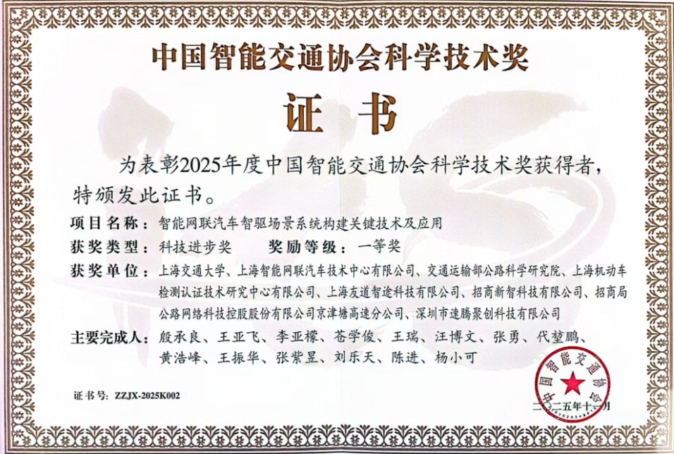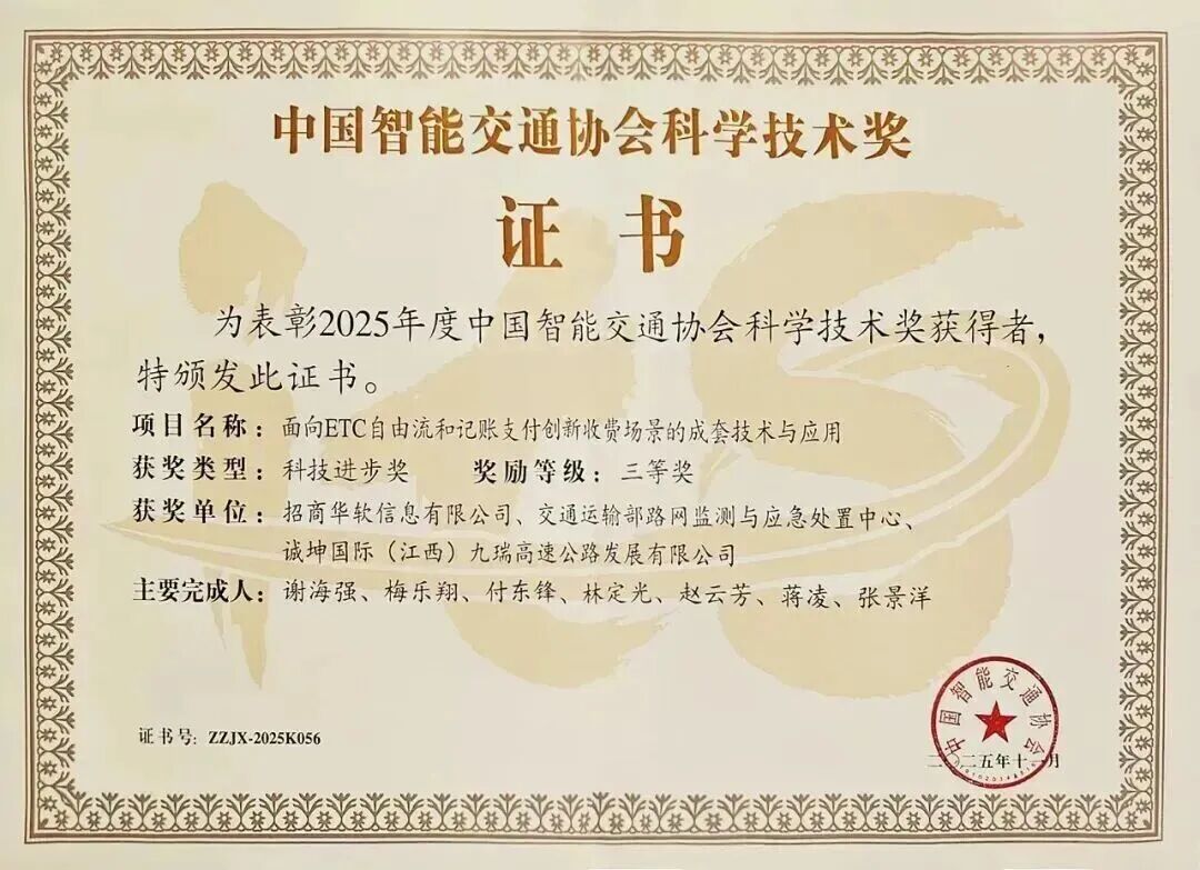 近日,在2025年第二十届中国智能交通大会科学技术奖颁奖典礼上,招商公路(001965)所属企业两项成果上榜:由招商新智、京津塘高速共同参与的《智能网联汽车智驱场景系统构建关键技术及应用》项目获得科技进步一等奖;由招商新智所属招商华软作为第一完成单位,联合九瑞高速等单位共同完成的《面向ETC自由流和记账支付创新收费场景的成套技术与应用》项目获颁科技进步三等奖。